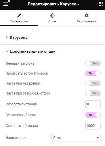 }Во вкладке «Содержимое» в дополнительных опциях выставить следующие параметры: